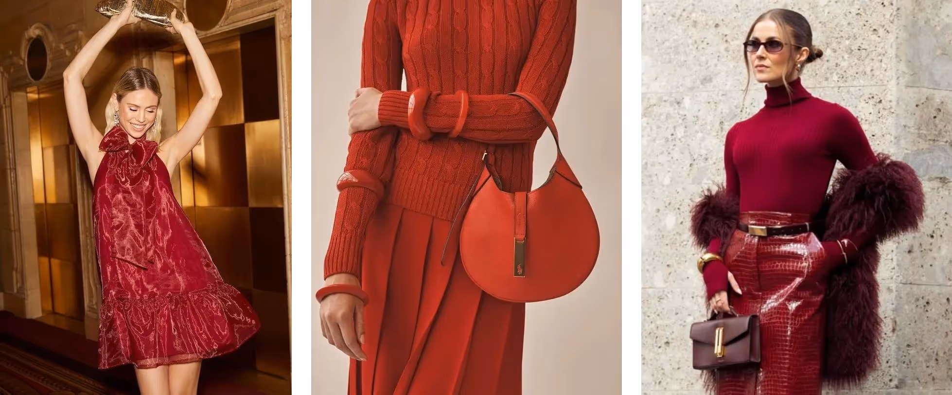 During the holiday season we tend to see a lot more red and this year is no different. The type of shade we see varies but this year we are seeing lots of bright red and burgundy as well. Although in the same family of color the shades exude a different look and feel when worn. Bright red tends to be a bit more cheerful while the darker reds add a bit more dramatic flair to your look.