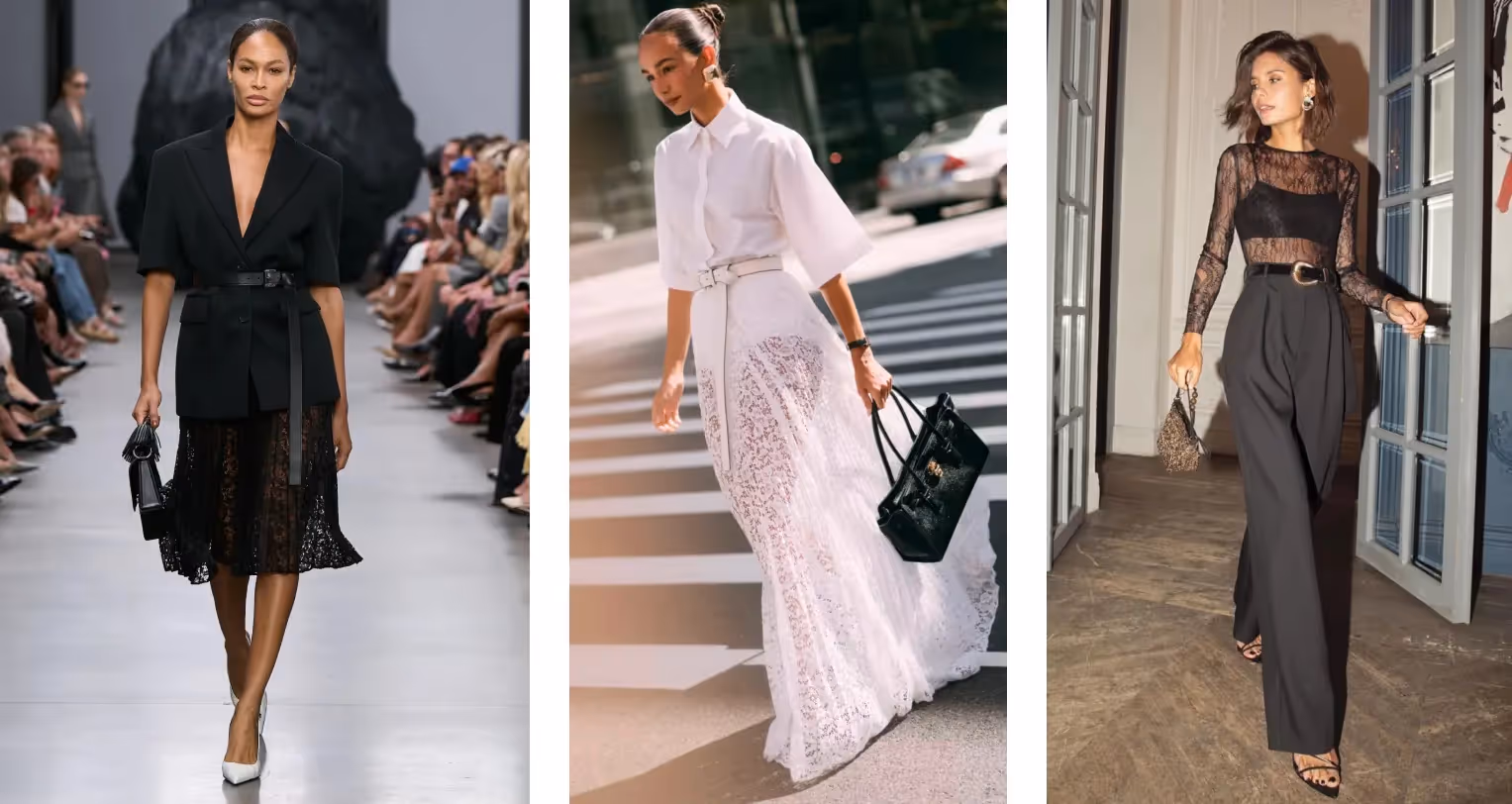 Lastly, lace is a trend we are also seeing (and loving). Whether worn or peeking out from a blouse or skirt for example, lace adds a dreamy, elegant flair that's perfect for the holidays. The lace looks on the runway have also been reimagined with a modern twist, we’ve seen sheer lace dresses, lace-trimmed skirts and romantic blouses that pair beautifully with leather and oversized blazers. If you want to look and feel both festive and sophisticated this season, then lace is a trend you must try!