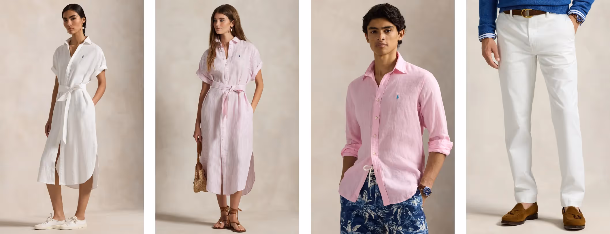When you shop at Ralph Lauren, you will find a selection of crisp white or pale pink ensembles that can be perfect options for Rosé all day. For the ladies, opt for a summer dress that you can elevate with statement accessories. For the gents, there are several options such as pink or white button down shirts or white pants.