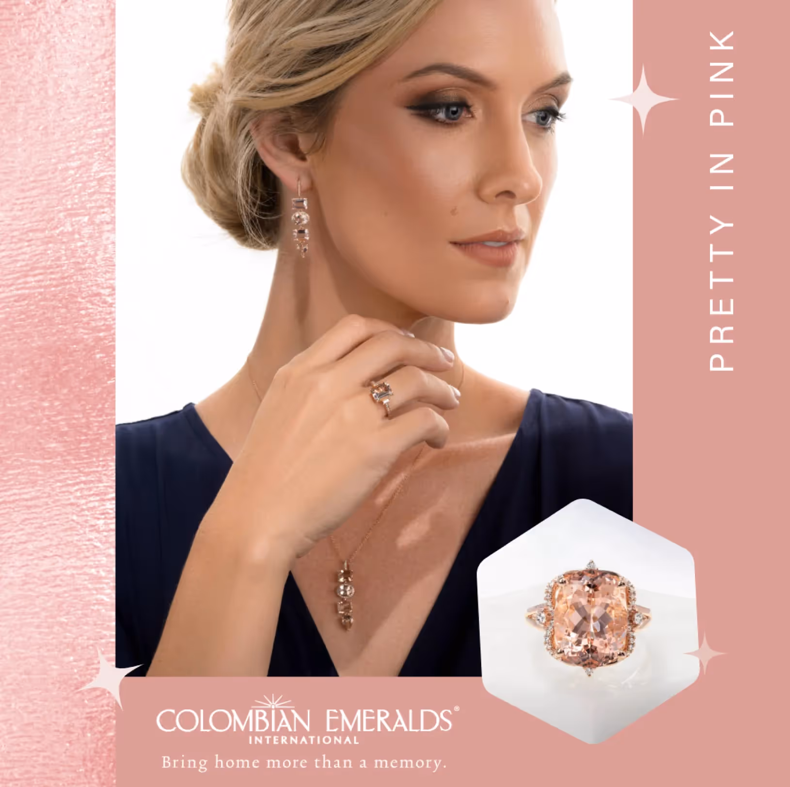 Jewelry is the finishing touch that transforms a beautiful outfit into an unforgettable look and nothing captures the theme quite like this morganite statement ring from Colombian Emeralds. With its captivating blush pink hue, this piece radiates elegance. Whether paired with a striking white or bold pink ensemble, this morganite ring adds the right amount of sparkle and sophistication to ensure you shine as brightly as the celebration itself.